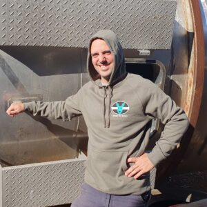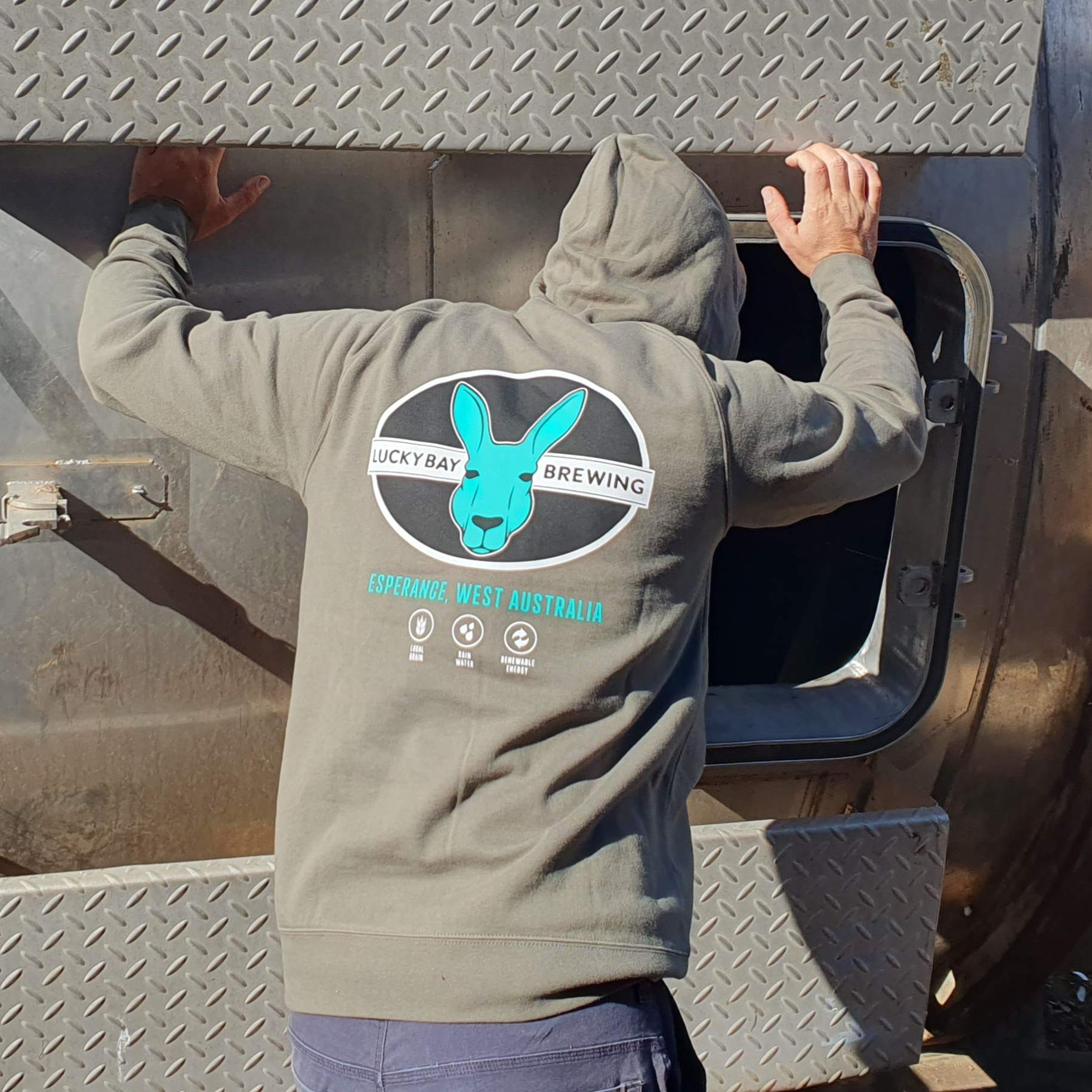 Cypress Hoody with pouch pocket at front. Unisex fit. Main Lucky Bay Brewing logo on back with Esperance West Australia words and ‘local grain/ rainwater/ renewables’ symbols. Small main logo on front left.